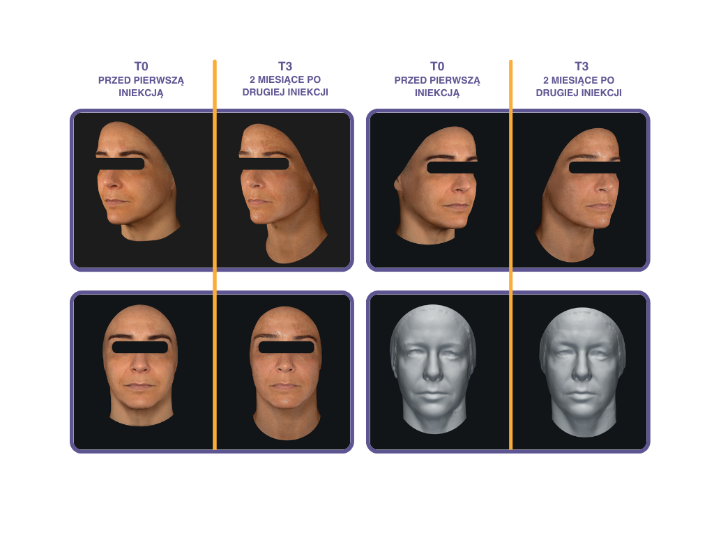 • Poprawa elastyczności i jędrności skóry, zapewniająca naturalny i długofalowy efekt estetyczny, z zachowaniem harmonii rysów twarzy zmieniających się w procesie starzenia.