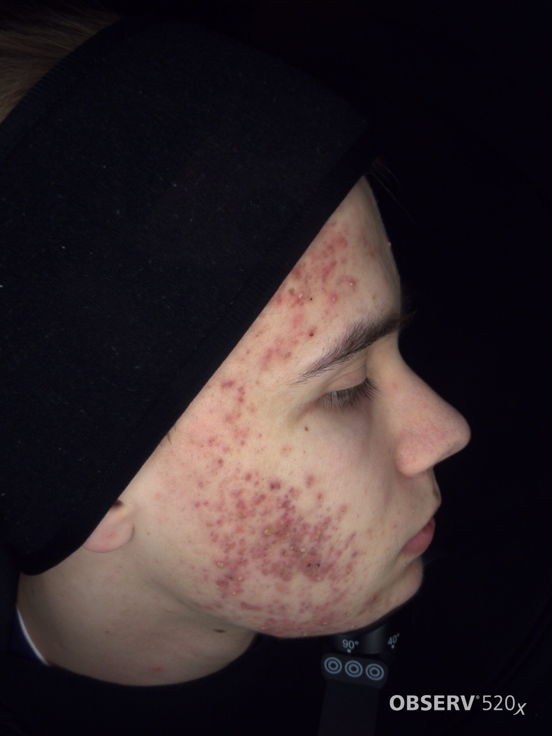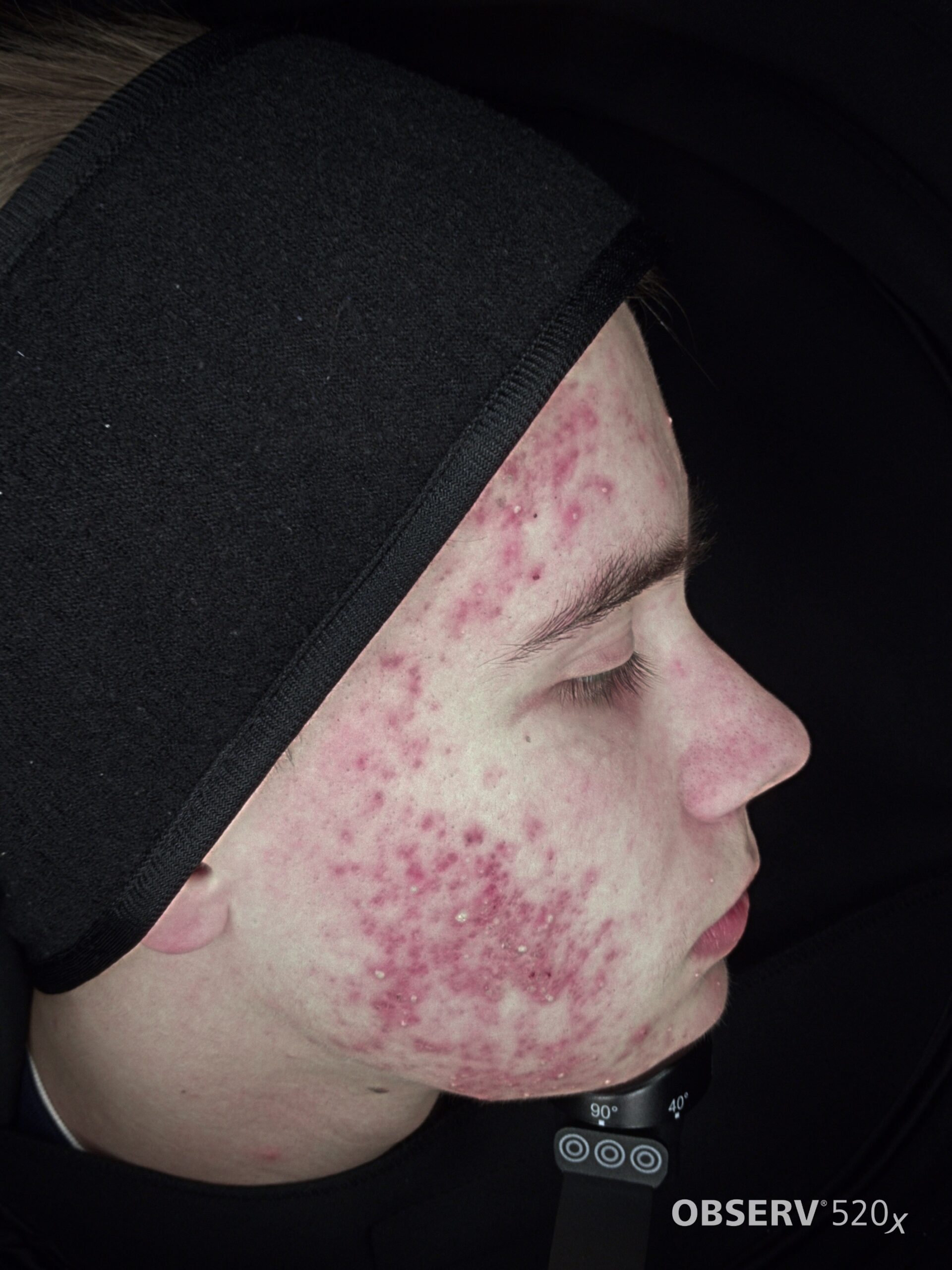 Do naszej kliniki zgłosił się 14-letni pacjent z nasilonym trądzikiem zapalnym o podłożu łojotokowym, obejmującym głównie policzki, żuchwę, czoło i skronie. Zmiany były liczne, obejmowały zaskórniki zamknięte, grudki, krosty, a także wyraźny rumień i aktywny stan zapalny. Dodatkowo skóra była przesuszona powierzchniowo, z oznakami odwodnienia, co często występuje przy trądziku młodzieńczym w fazie progresji.