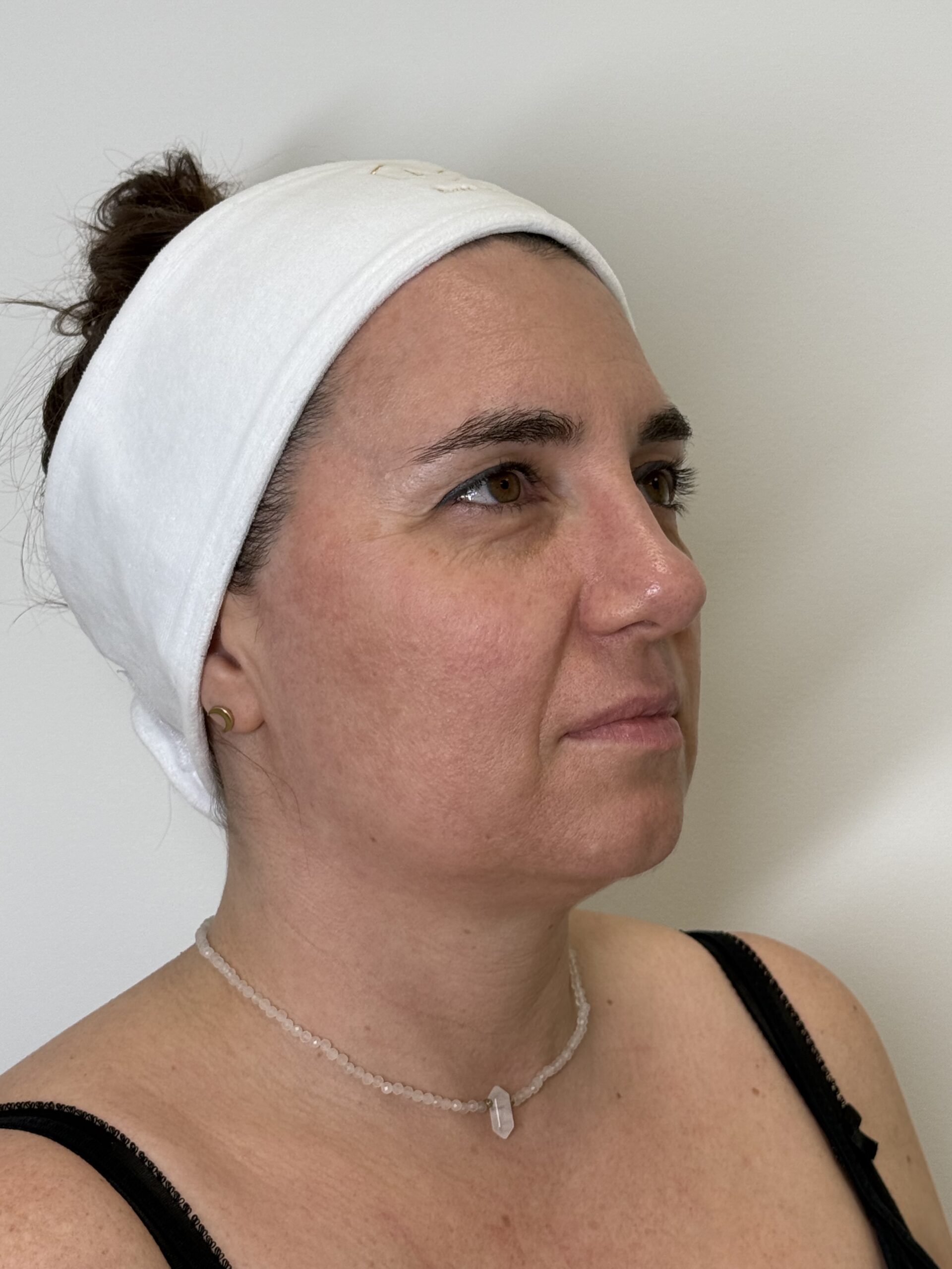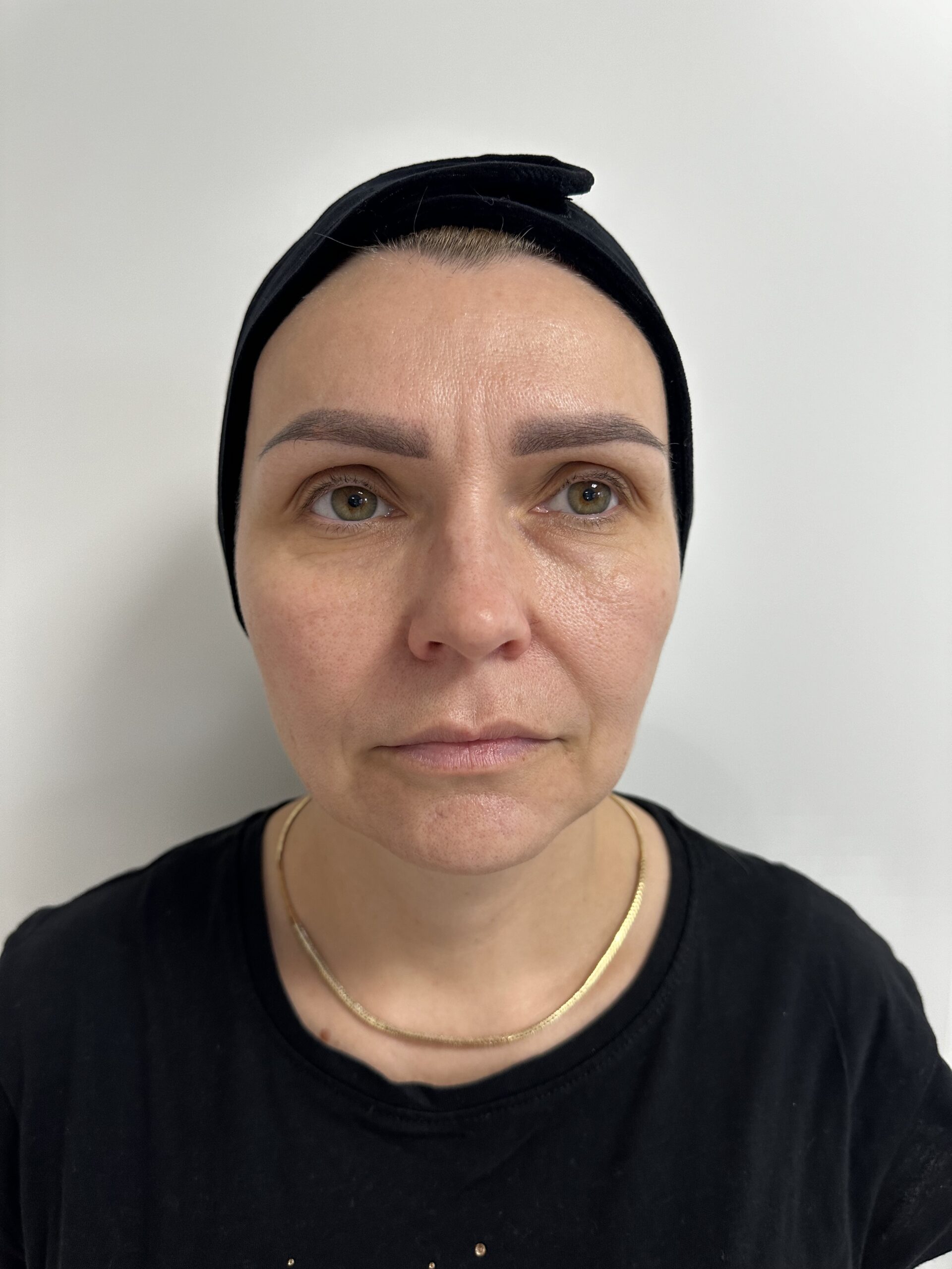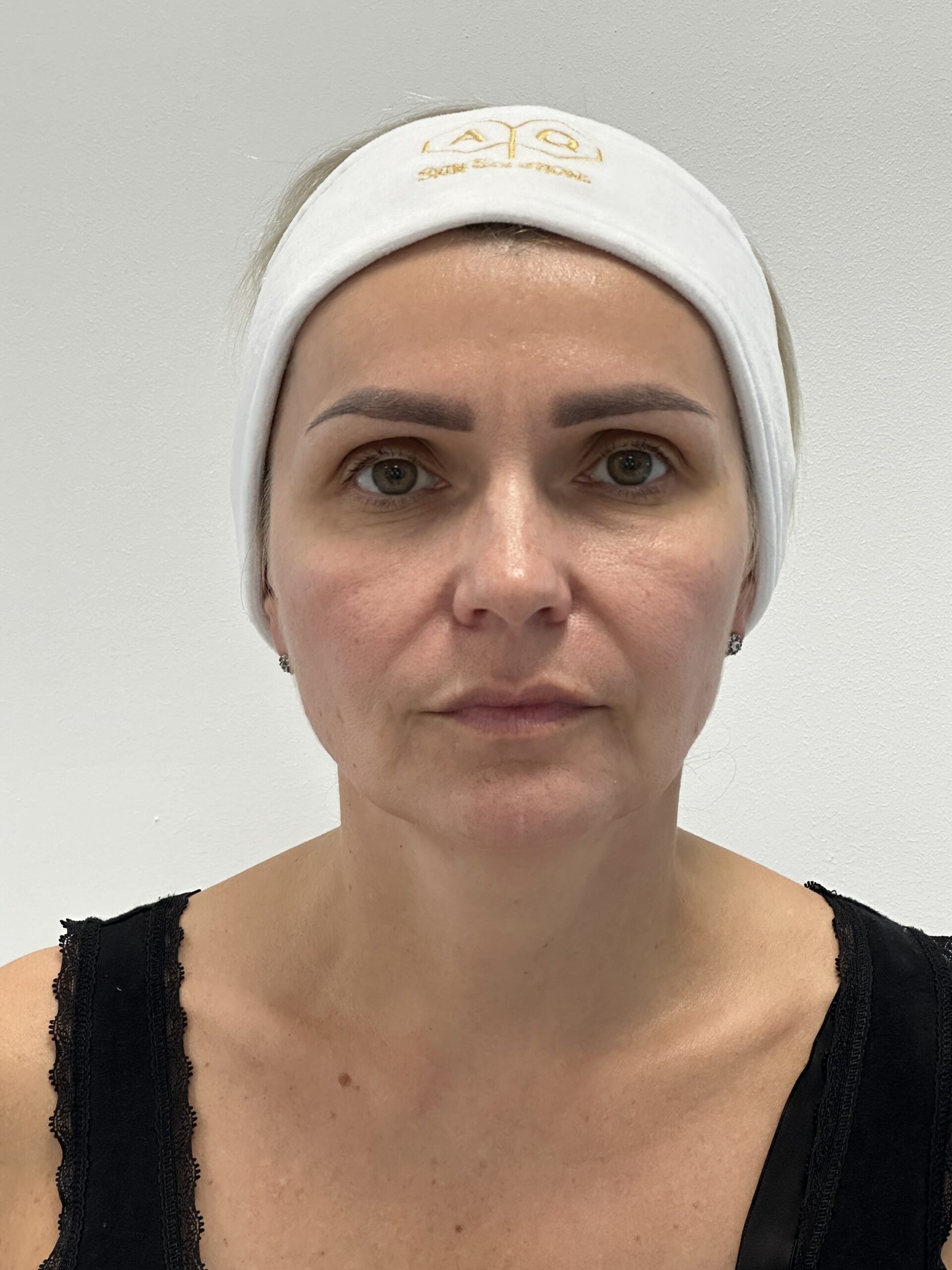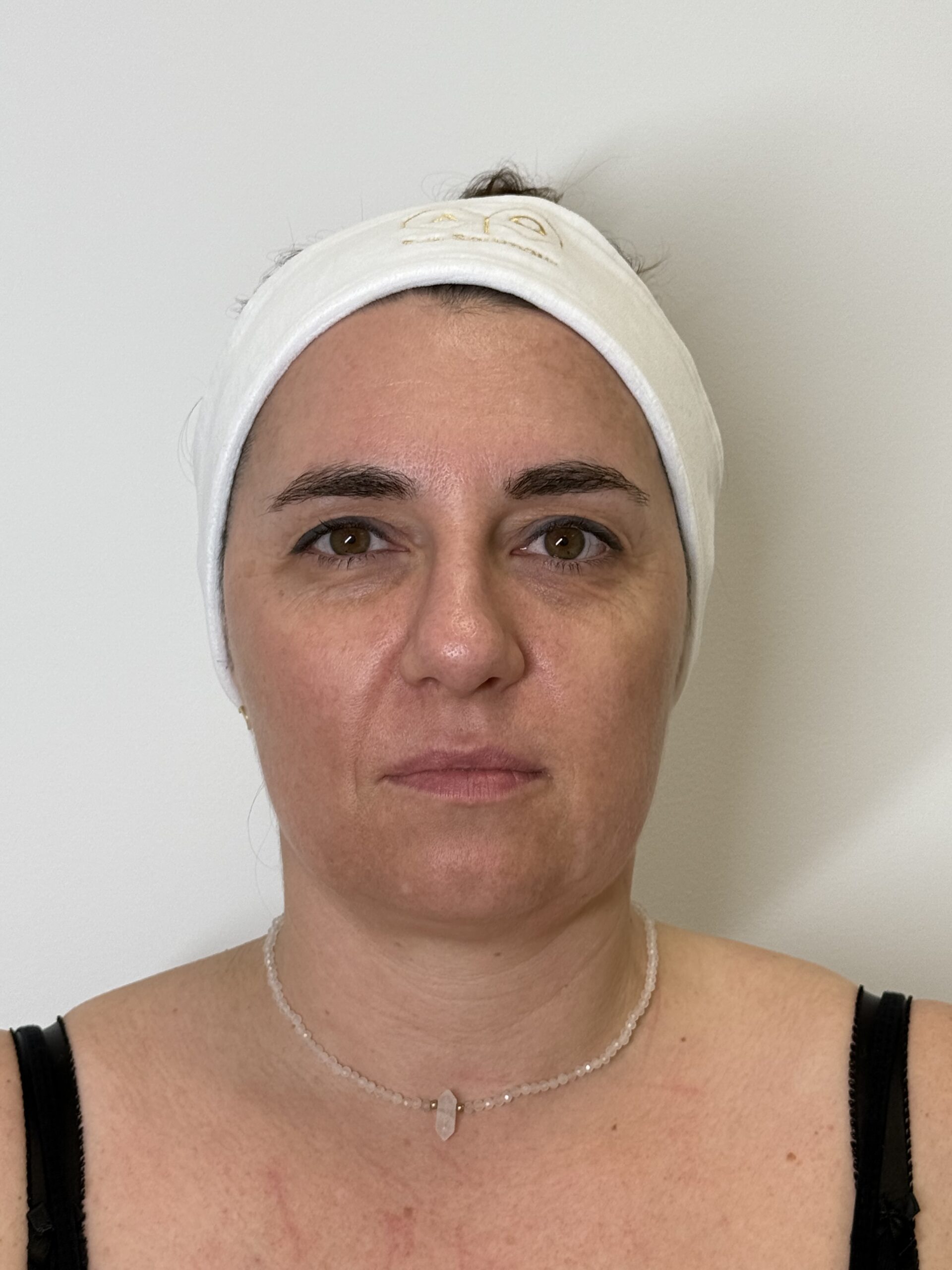 Pacjentka zgłosiła się z wyraźnie uwrażliwioną, cienką skórą twarzy, o strukturze porównywalnej do papierowej – z cechami fotostarzenia, odwodnienia i znacznej utraty sprężystości. Występowały przebarwienia posłoneczne, rumień naczyniowy, utrwalone zmarszczki mimiczne oraz pogłębiająca się wiotkość dolnej części twarzy. Celem terapii była odbudowa struktury skóry, rozjaśnienie kolorytu, wzmocnienie napięcia i odmłodzenie twarzy w sposób naturalny, nienaruszający rysów.