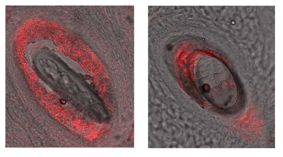 Rysunek 1 – Powyższe obrazy pokazują, jak te specjalne liposomy skupiają się wokół pęcherzyka (czerwona fluorescencja).
